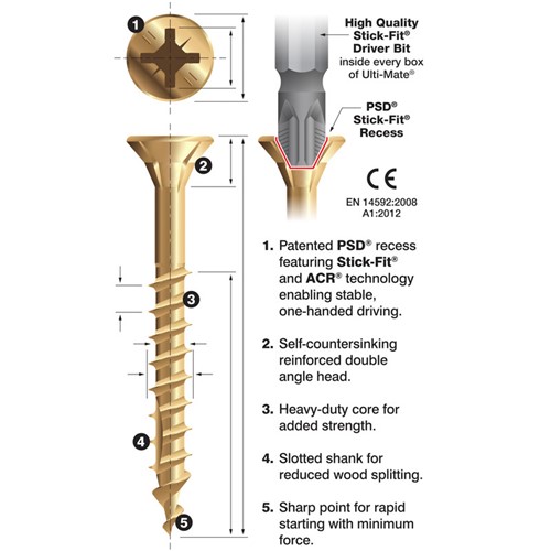 The Ulti-mate screws come yellow plated and are our most popular wood screw with a high performance ideal for tradesmen and DIY'ers alike. In every box you received a high quality stick-fit driver bit and can be used to fix all types of timber and sheet material products.