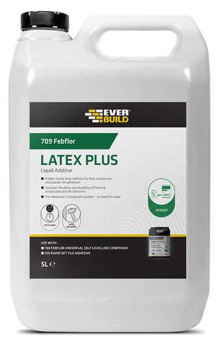 5ltr 709 FebFlor Latex Plus is a premium rubber based latex additive for use with Self Level Floor Compound and powder tile adhesives to both strengthen the mix and provide a limited degree of movement capability in the sub floor. Ideal for use when covering sound timber flooring substrates to allow for limited amount of movement. A 5 litre container is sufficient to mix a 20 kilo bag of Self Level Floor Compound or adhesive.