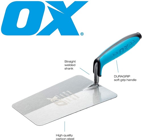The OX-P013718 OX Pro Bucket Trowel 7"/180mm is a professional-grade tool designed for scooping, mixing, and applying mortar directly from the bucket. Made from hardened and tempered carbon steel, the blade is strong and durable, with a wide design for efficient loading. The ergonomic DURAGRIP handle provides comfort, control, and reduced fatigue during extended use. Ideal for bricklayers and site professionals who need a tough, reliable bucket trowel for daily work.